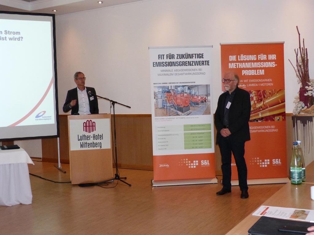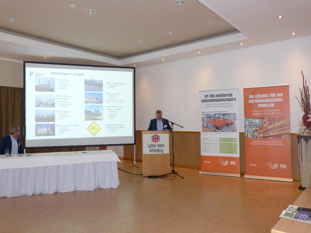 Die S&L Energie-Projekte GmbH und die Co-Gastgeber von den Stadtwerken Lutherstadt Wittenberg referierten über die Alternative Lambda-1-BHKW, mit der sehr hohe Gesamtwirkungsgrade erreicht werden und die neuen Emissionsgrenzwerte ohne komplexe Anlagentechnik problemlos eingehalten bzw. sogar deutlich unterschritten werden können. Dadurch lassen sich insbesondere hunderte Tonnen an Emissionen des besonders klimaschädlichen Methans verhindern. Dass dies auch in der Praxis funktioniert, zeigten die Stadtwerke am zweiten Veranstaltungstag, als die Teilnehmer die Möglichkeit hatten das wohl größte Lambda-1-BHKW in Deutschland mit 4 x 1,5 MWe zu besichtigen.